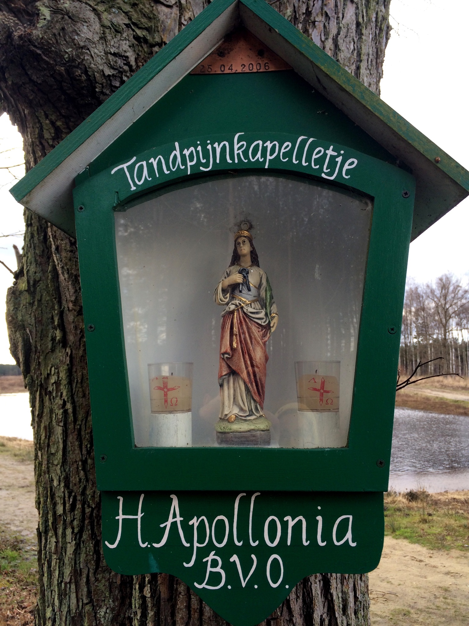 At this crossing you can admire the little chapel of the Holy Apollonia, better known as the tandpijnkapelletje (toothache chapel), where people come to pray to get rid of their toothache. Behind this funny fact is the rather gruesome story of Apollonia, who by an uprising against Christians in Alexandria got her teeth pulled out in a violent way. For this reason, she is regarded as the patroness of dentistry and those suffering from toothache. Here we turn to the right and a bit further you are walking in between the forest and the heath landscape. You turn left into the forest and will encounter another mere a bit further, once past this one you turn to the right. Soon you’ll cross the big Averboodse baan (N165) and continue into the woods. Now keep on following the route on the map. When you arrive at the clog museum you have to cross a road again…or you can have a drink in the museum café.