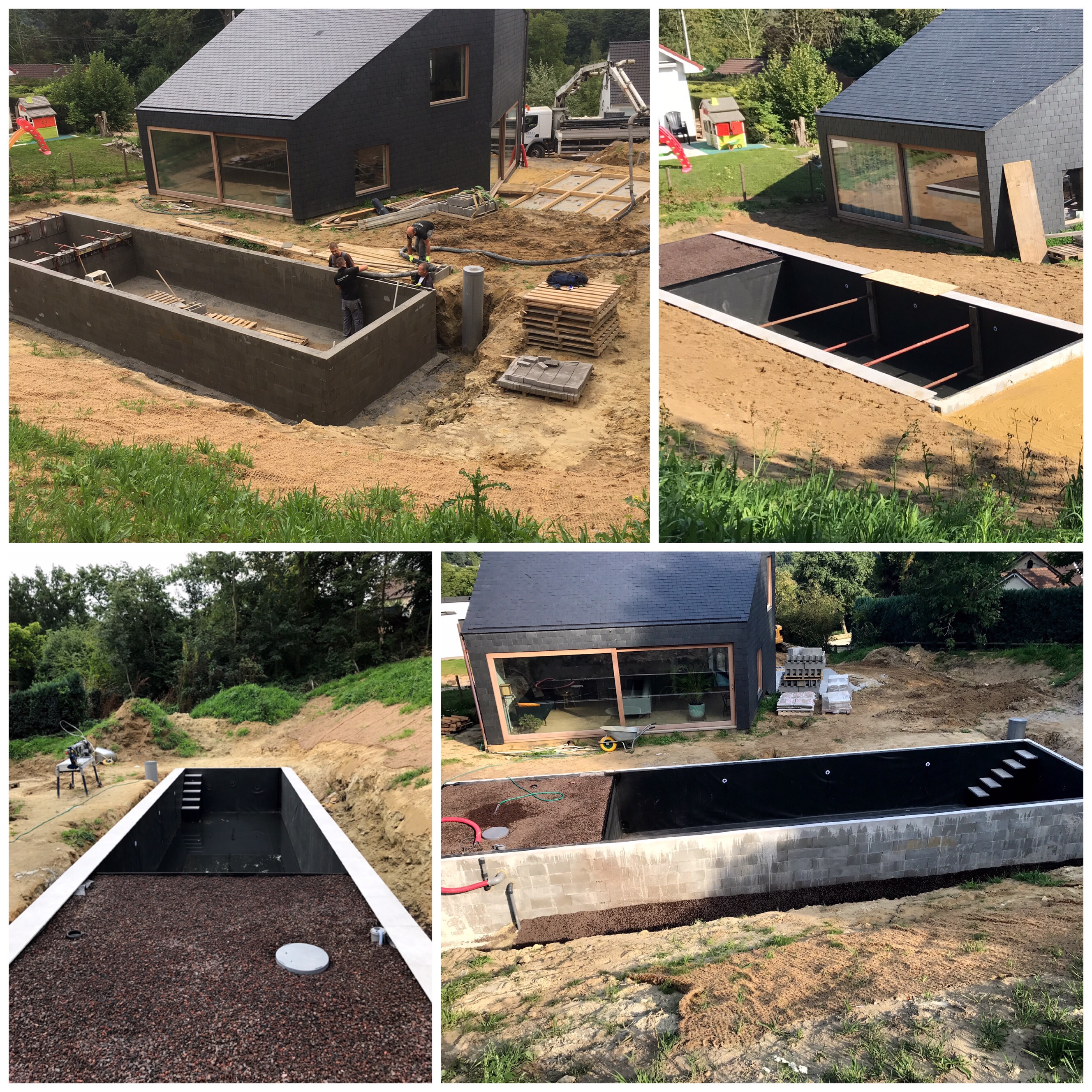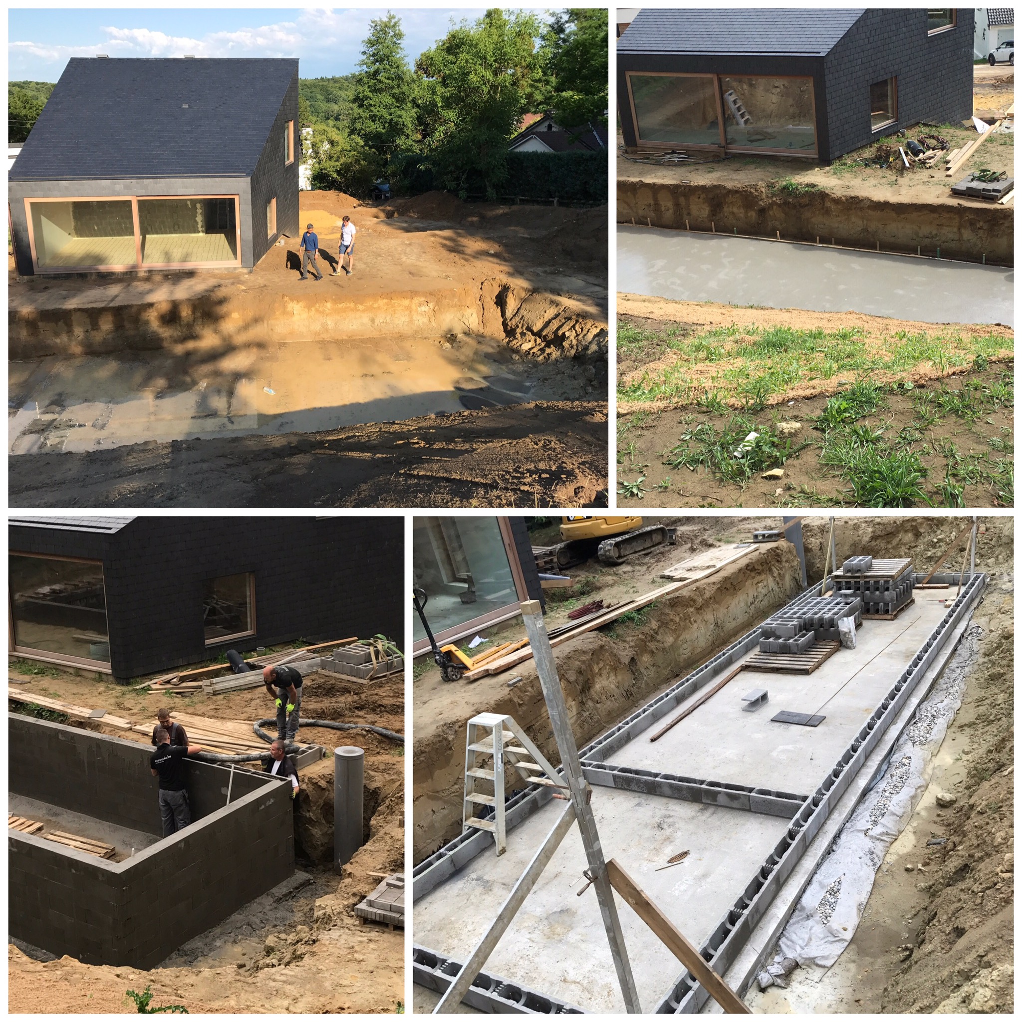 Because our garden is on quite a steep slope we didn’t had so much choice of where to put it. Local regulations also only allow a pool or pond when it’s behind your house to be built without a building permit. So behind the house it is. The same topographical limitations on our plot made us choose for a straight and less natural form. The idea is to really use it to swim laps, so the long narrow shape was quite perfect for that.
