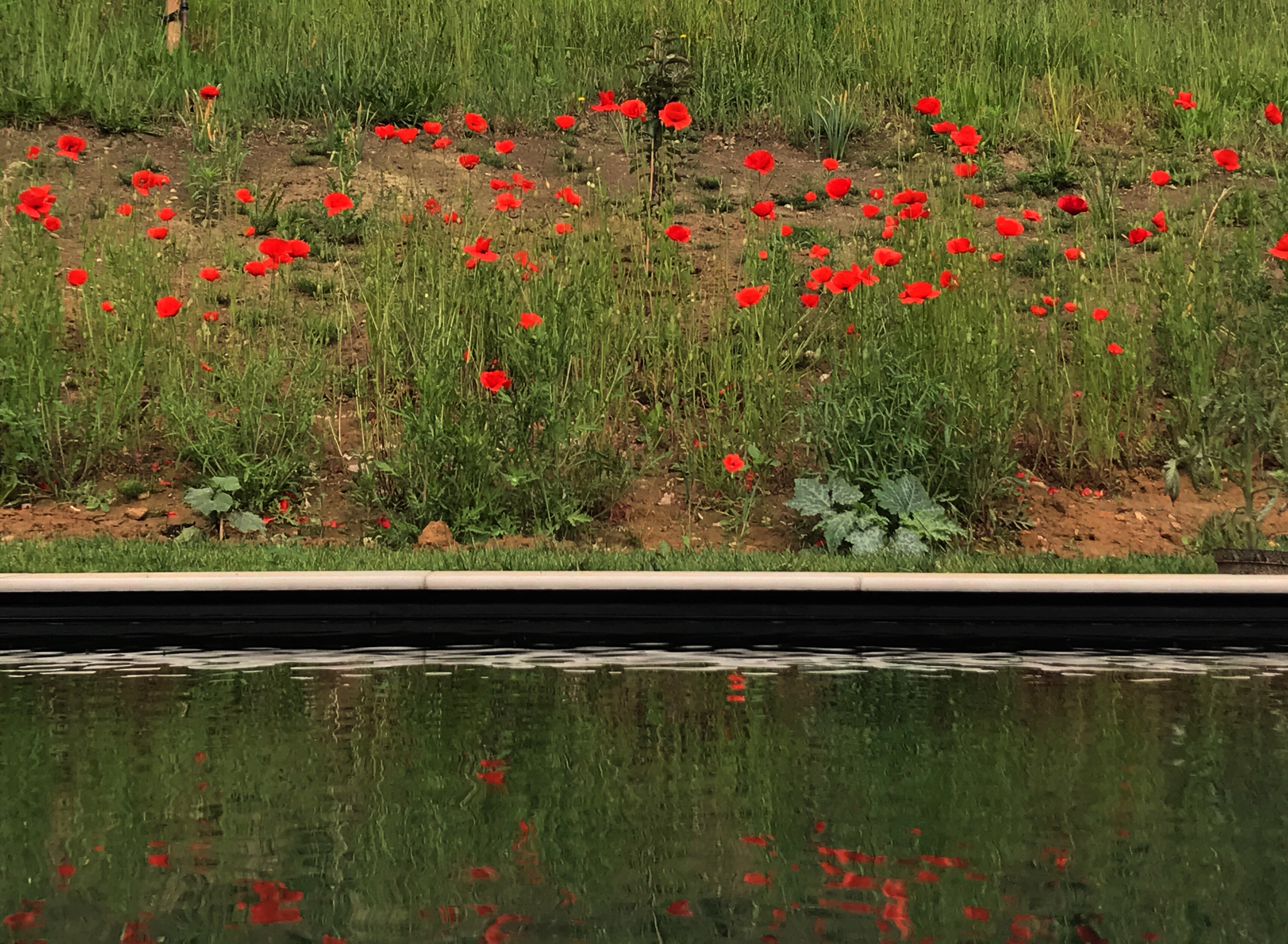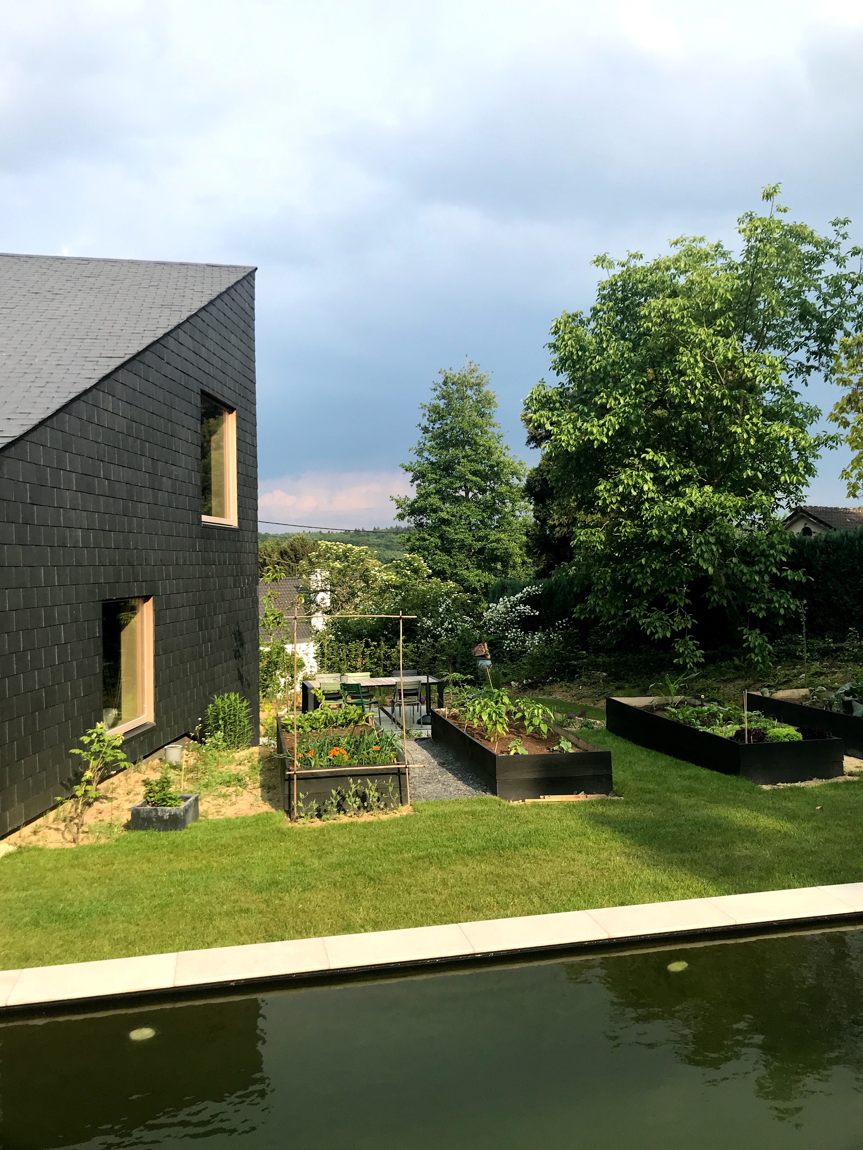 The most used part of the garden this month must be the natural swimming pond. The water is crystal clear and has heated up to a lovely 24° C, just by the sun. The plants have grown a lot and earlier this year we had quite some algae. Now the algae have gone, it seems the plants are suffering a bit. I suppose the downside of the crystal clear water is that the plants lack a bit of nutritiens. Water beetles have found their way to the pond, and also many kinds of dragonflies love to hang around. It’s great to swim in natural water, without all the chlorine, and at the same time attract wildlife. The swallows love to dive straight towards the water to drink… it’s like having an airshow every day.