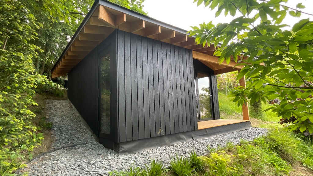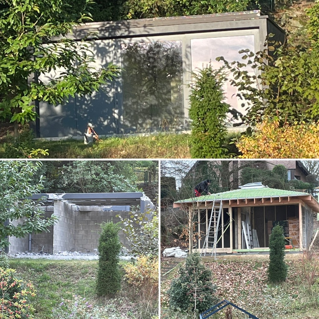 Another big change is the garden shed. The original building was not the prettiest and, with all the home work, we needed an office. So we got people to give it a drastic make-over, add a new roof, insolate it. The materials match quite well with our house. Natural slate on the roof, wooden beams and charred wood on the walls.