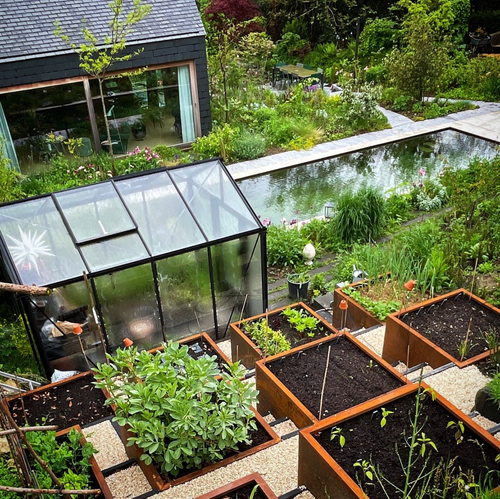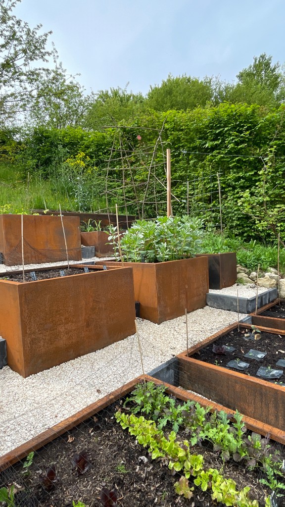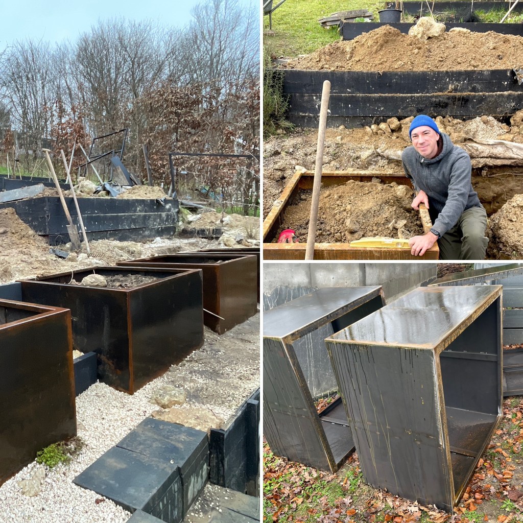 Our kitchen garden on the slope next to the greenhouse is completely redone. The old wooden raised beds started to dangerously bend, caused by wood rot and gravity. So I wanted to replace them with something that would keep forever, has low maintenance and still look good. So we came up with corten steel beds. This would also tie the kitchen together with some other corten elements in the garden. After digging and removing many m3 of soil I got them finally in. The result is really nice, in my opinion at least, and it makes maintenance in the kitchen garden much easier.